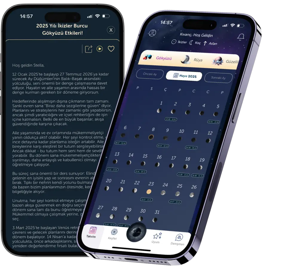 Astopia, doğum haritana özel analizlerle 2025 yılının aşk, kariyer ve kişisel gelişim alanlarında sana neler getireceğini ortaya çıkarıyor. Hangi günlerde aşk hayatında dönüm noktaları yaşayabilir, kariyerinde hangi gezegenlerin desteğiyle yükselme şansı bulabilirsin? Tüm bu soruların cevapları, sana özel 2025 gökyüzü yorumlarında!